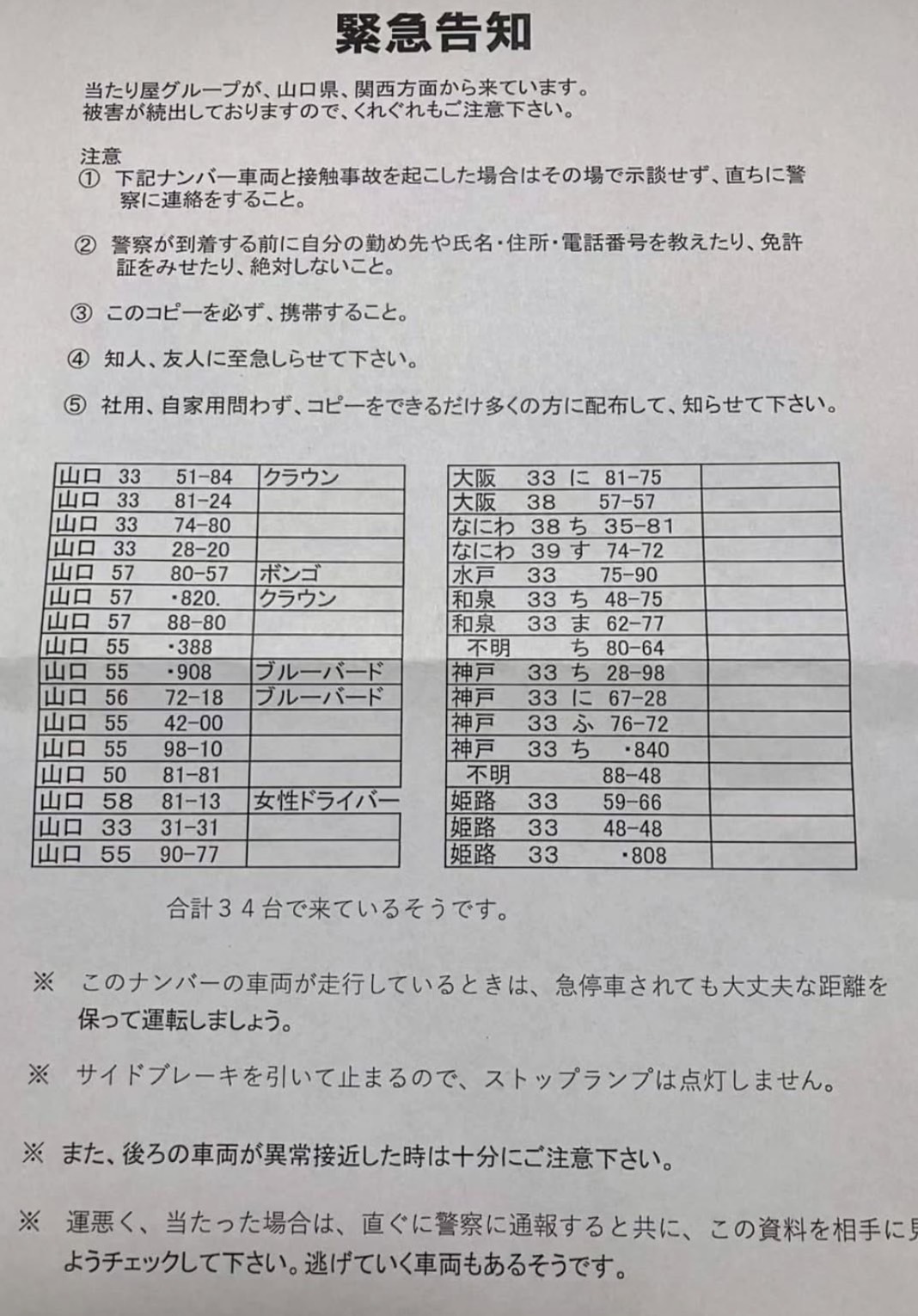 おそらく最初は「当たり屋グループ出現」といった内容の
