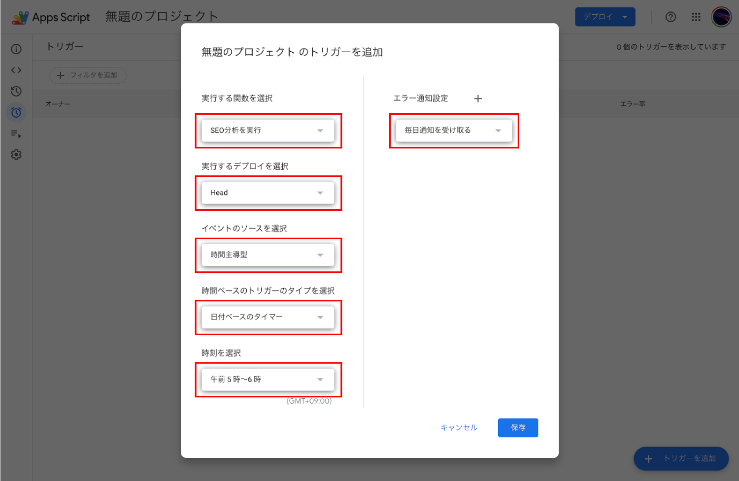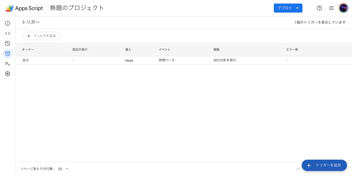 SEO分析を実行 に対してトリガーを設定していれば、毎日自動で動きます。