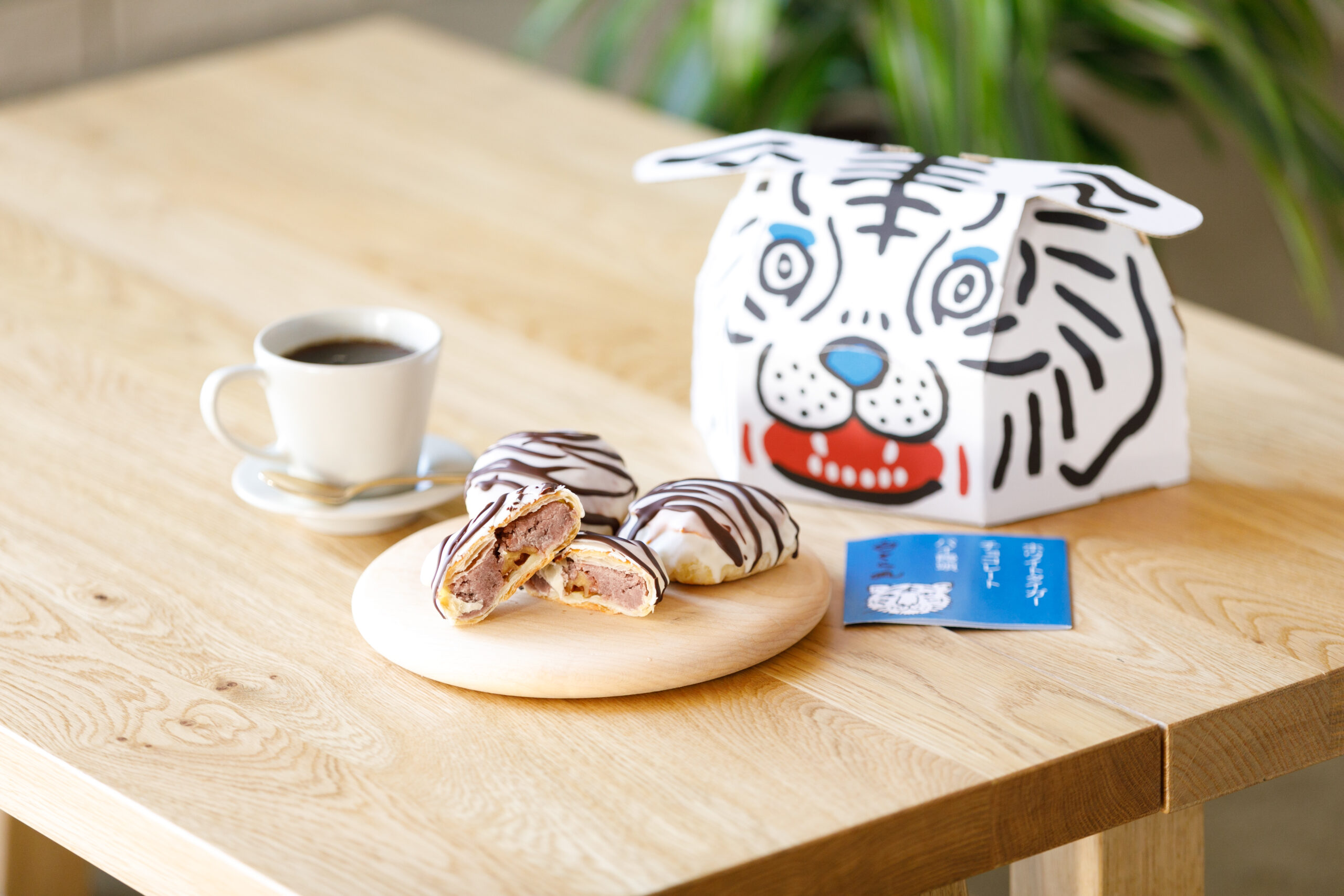 香川県東かがわ市にある和洋菓子店 巴堂 様と、しろとり動物園 様のコラボレーション商品として誕生したホワイトタイガーチョコレートパイ饅頭「白とら丸」。