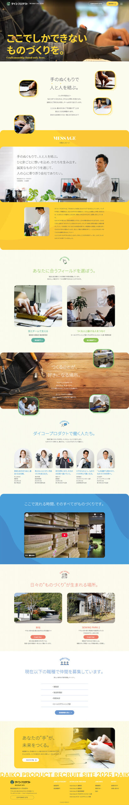 手袋・バッグ・小物雑貨の企画・製造・販売の企業向けに、株式会社ダイコープロダクト様の仕事内容や働くイメージが伝わる採用導線を整えることを目的としたリクルートサイトを制作しました。